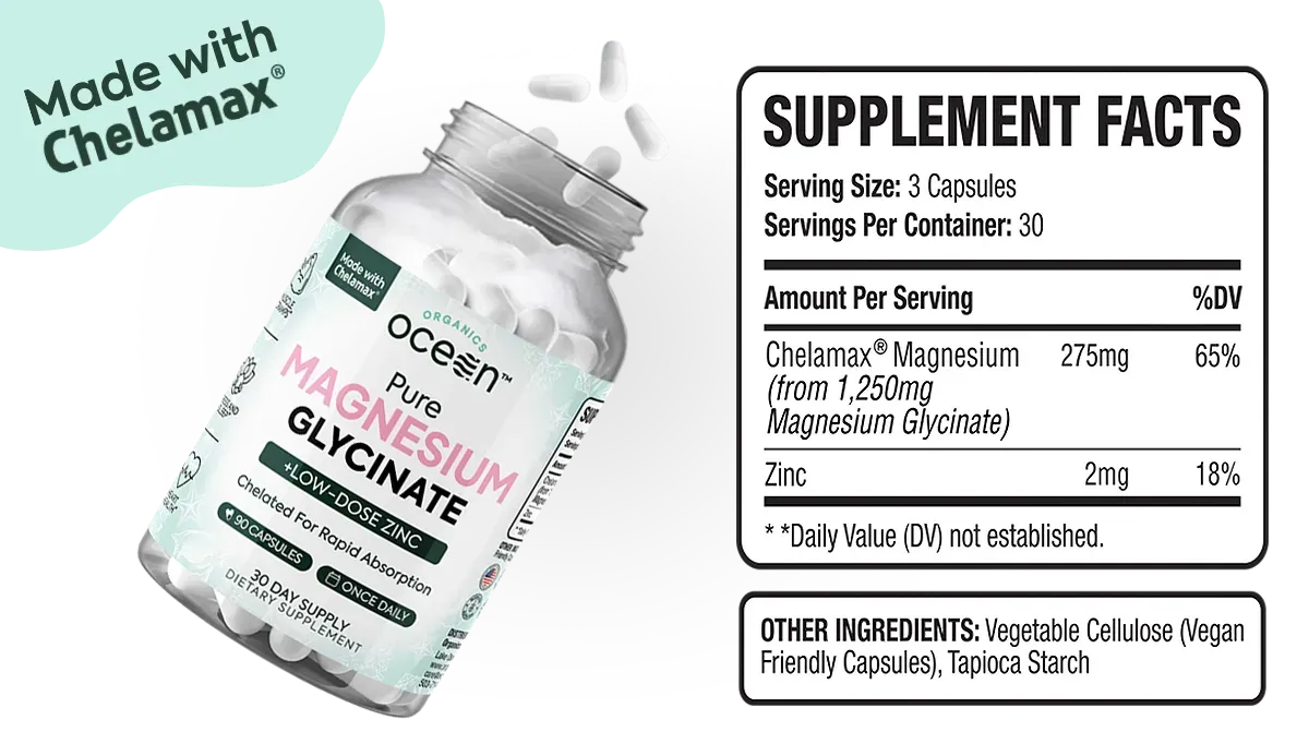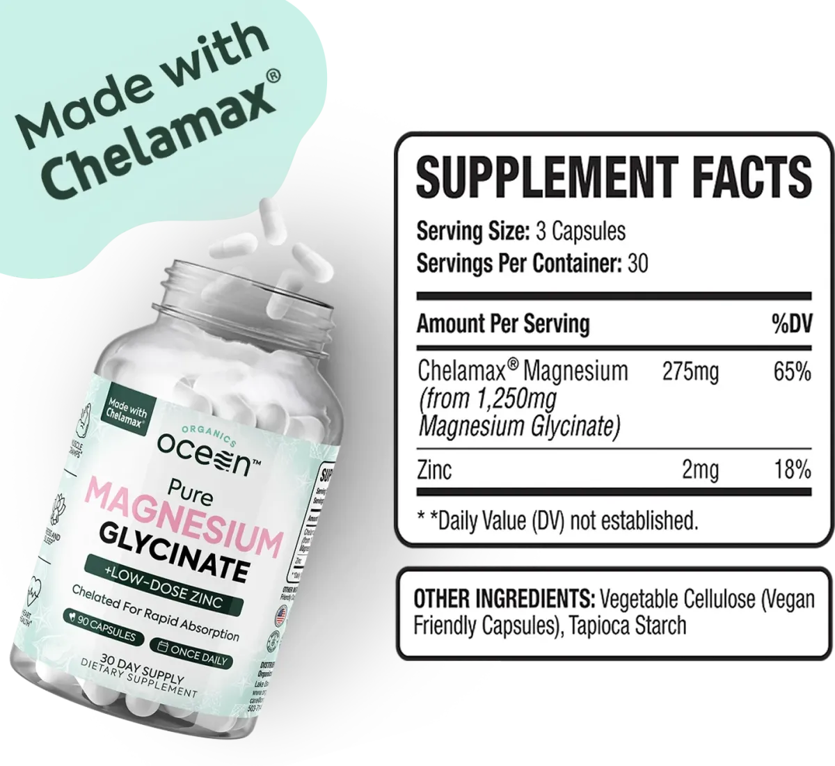 "My daughter, an R.N. suggested Pure Magnesium Glycinate from Organics Ocean. I've been taking 2 of these capsules daily for 2 weeks and haven't had a single [muscle] cramp in that time.